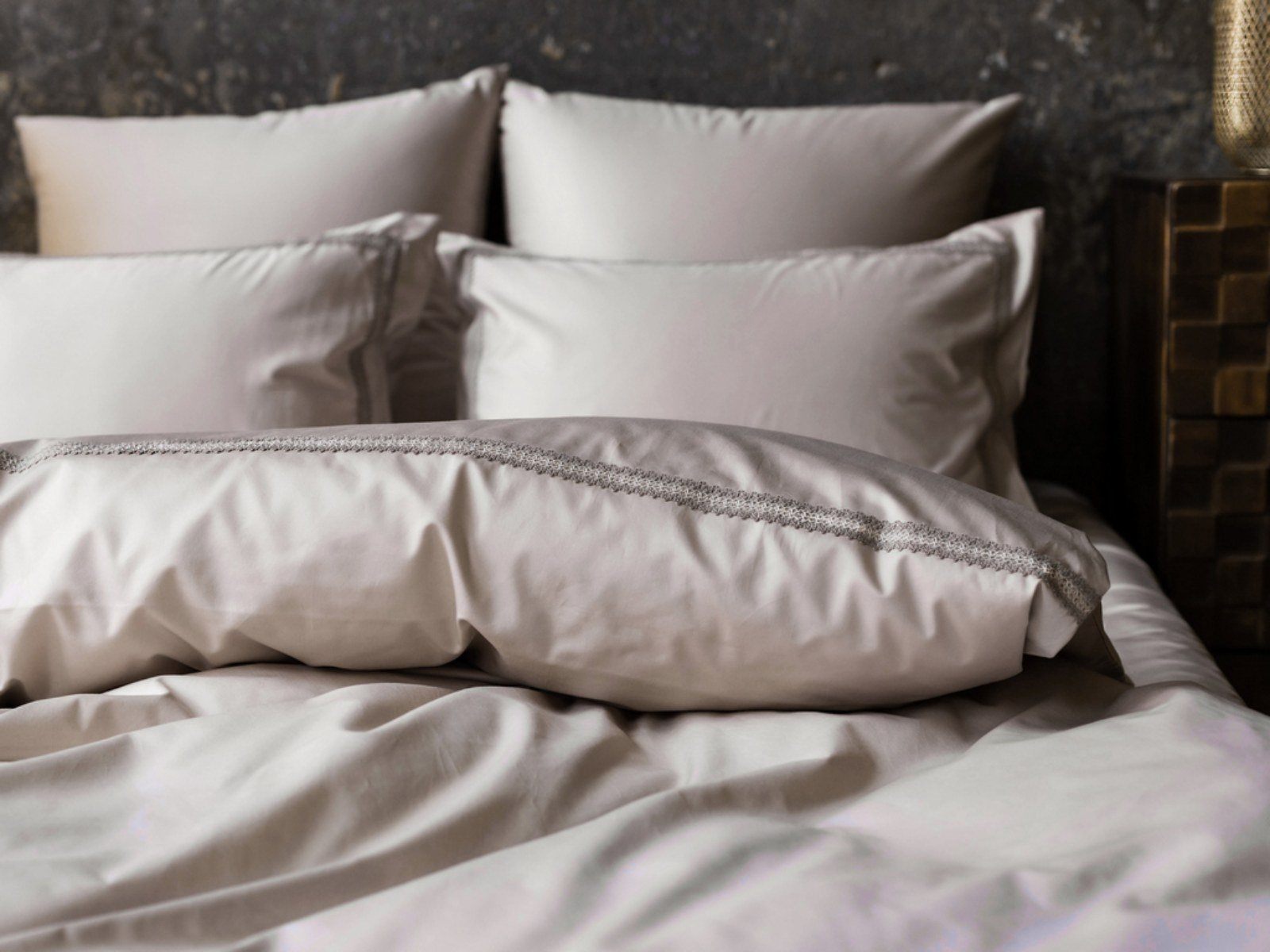 Наволочки "оксфордские", отделанные ШИРОКИМ КРУЖЕВОМ (на запахе), пододеяльник на потайной молнии, отделанный ШИРОКИМ КРУЖЕВОМ. Цвет основной ткани: бежевый; цвет кружева: бежевый.