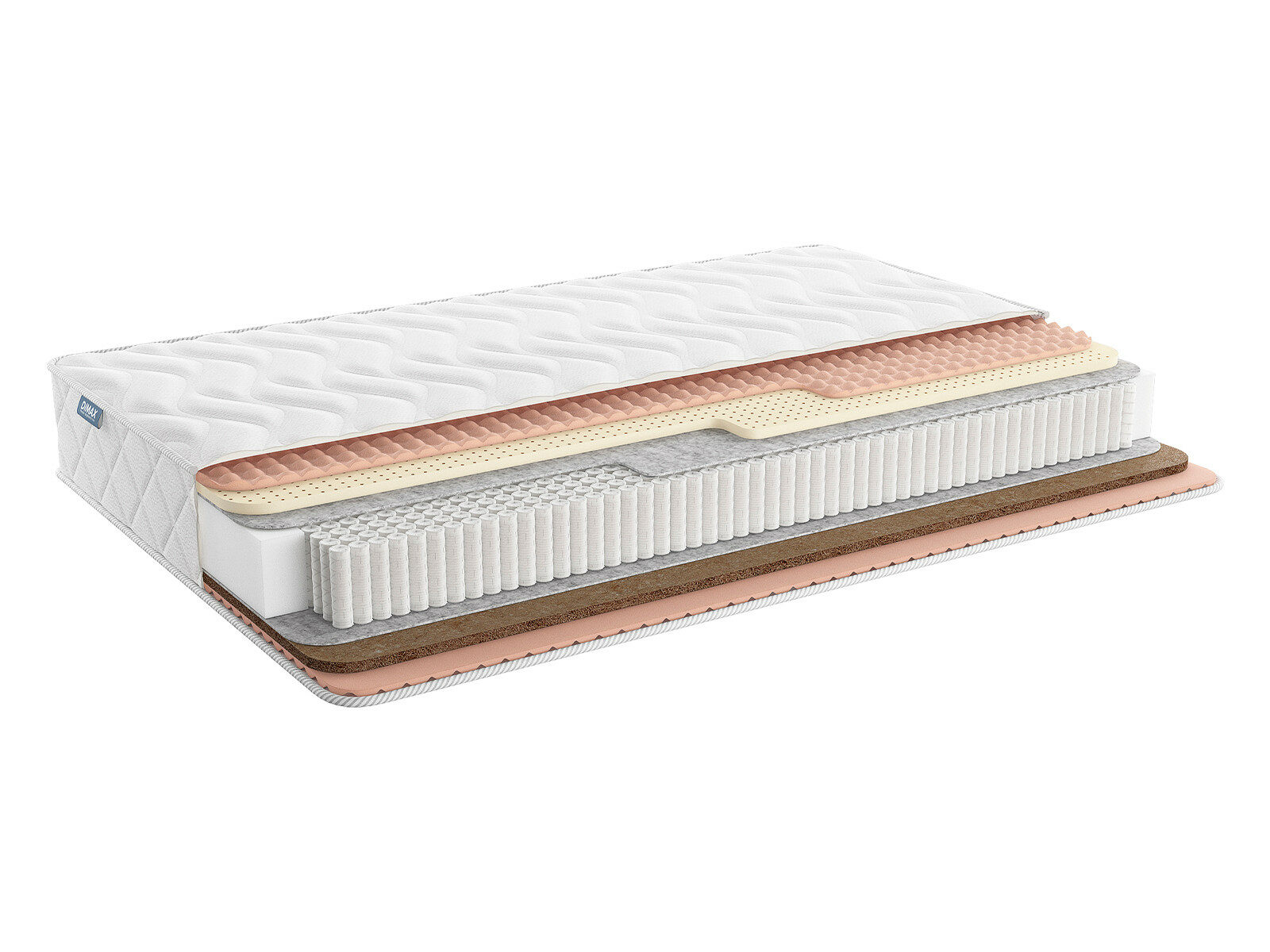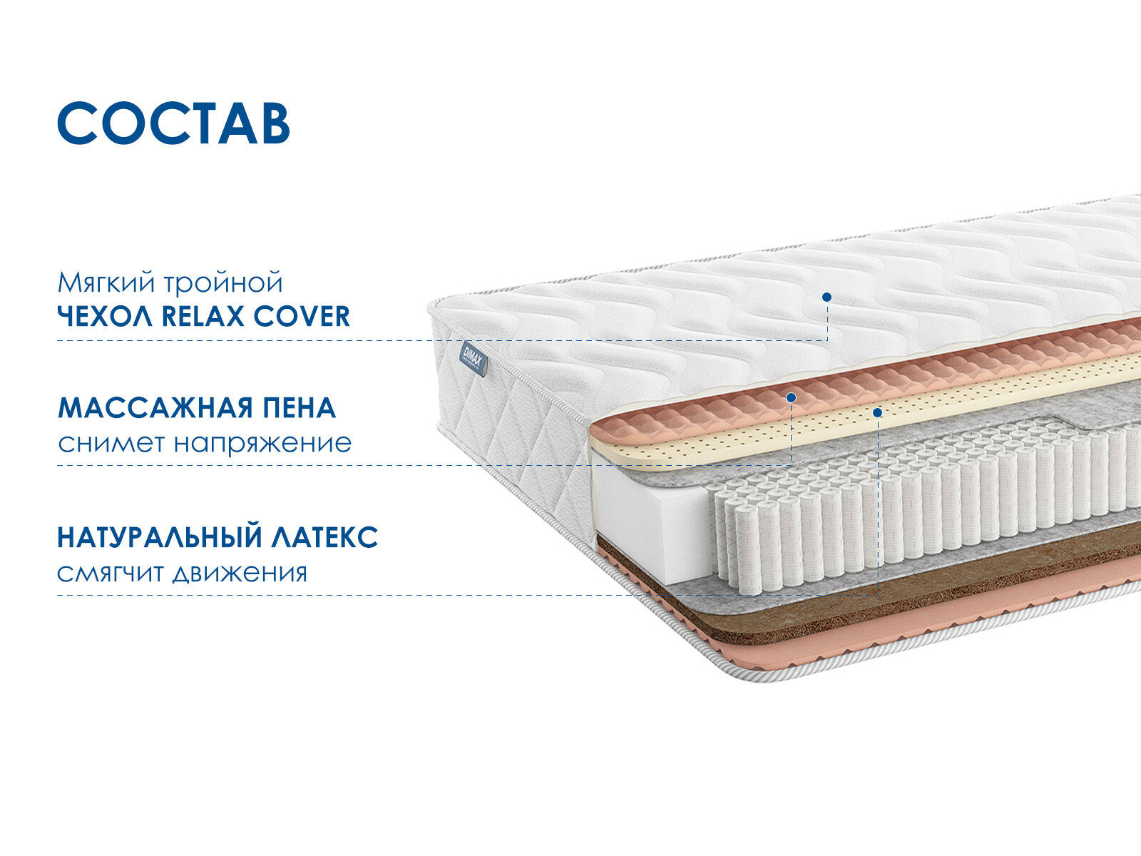 Димакс Relmas Mix 4 S1000 – массажный ортопедический матрас с разной жёсткостью сторон. Модель сочетает в себе передовые натуральные наполнители и современный пружинный блок, обеспечивая полноценный комфорт и поддержку для тела.