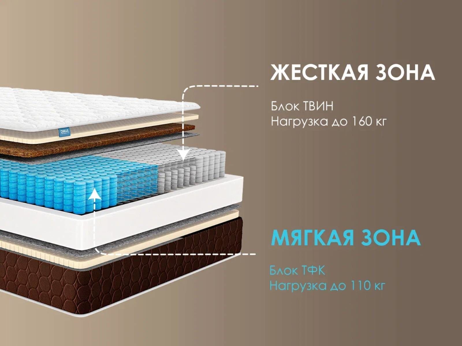 Димакс Дуэт Лайт – это двусторонний матрас для пар, в котором сочетаются два разных блока независимых пружин. Такая конструкция даёт каждой половине индивидуальный уровень жёсткости и выдерживает различные нагрузки, обеспечивая комфортный сон даже при существенной разнице в весе.