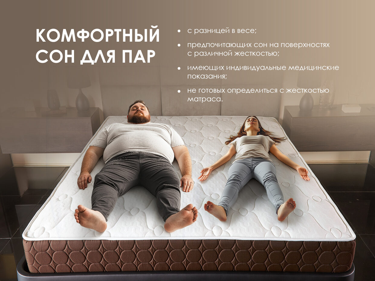 Модель дарит каждой половине матраса собственный уровень жёсткости и поддержку, избавляя спящих от необходимости подстраиваться друг под друга. Матрас идеально подойдёт парам с большой разницей в весе или росте.