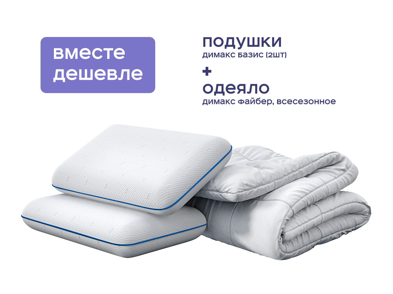 Комплект одеяло Димакс Файбер всесезонное + подушка Димакс Базис 2 шт. — готовое решение для здорового сна вдвоём или приема гостей. Покупая набор, вы экономите до 48% и получаете всё необходимое: универсальное одеяло с климат-контролем и две анатомические подушки, которые вместе создают условия для комфорта в любой сезон года. Больше не нужно выбирать между теплом, поддержкой и гигиеной — этот комплект заботится о вашем сне.