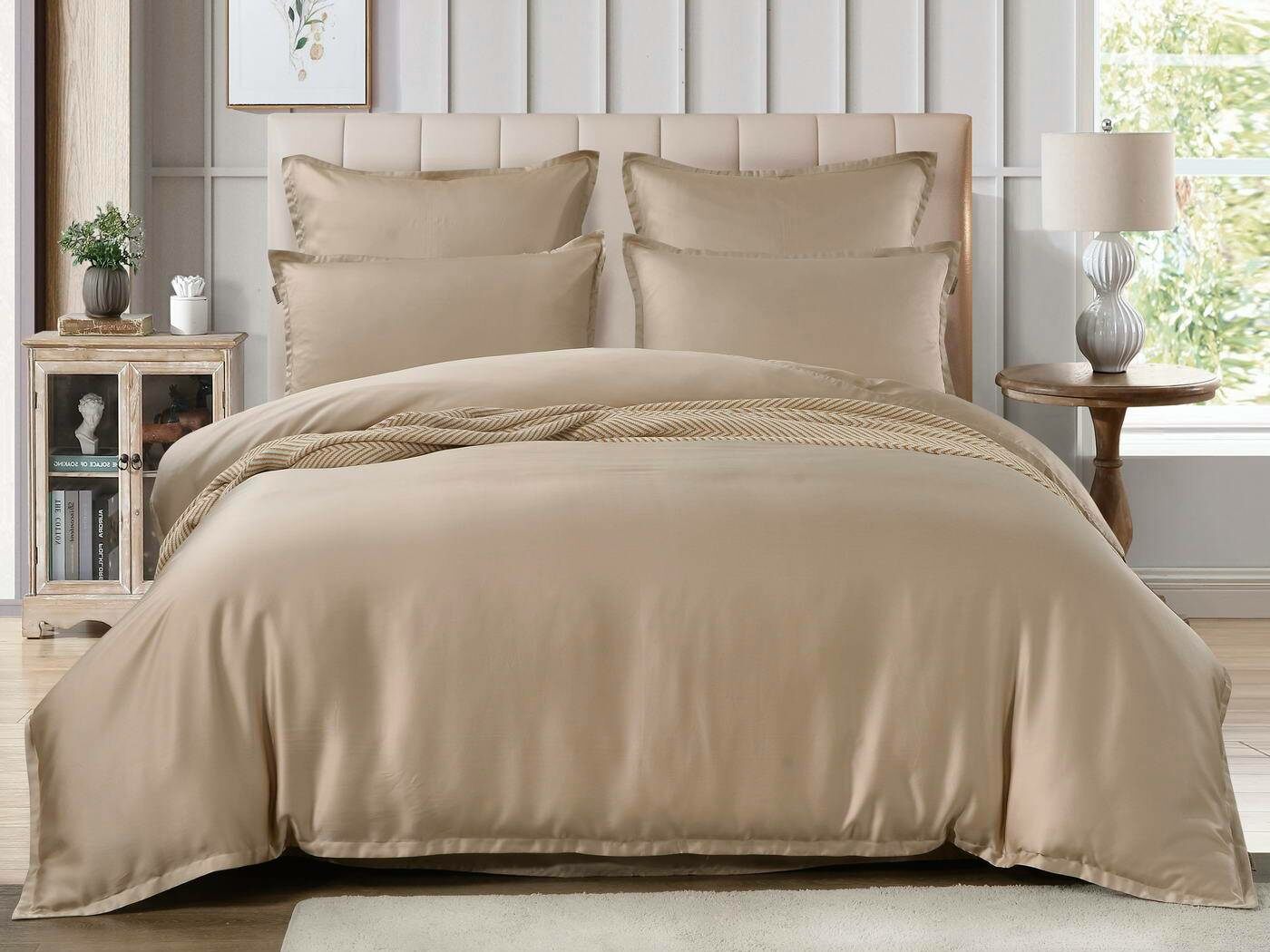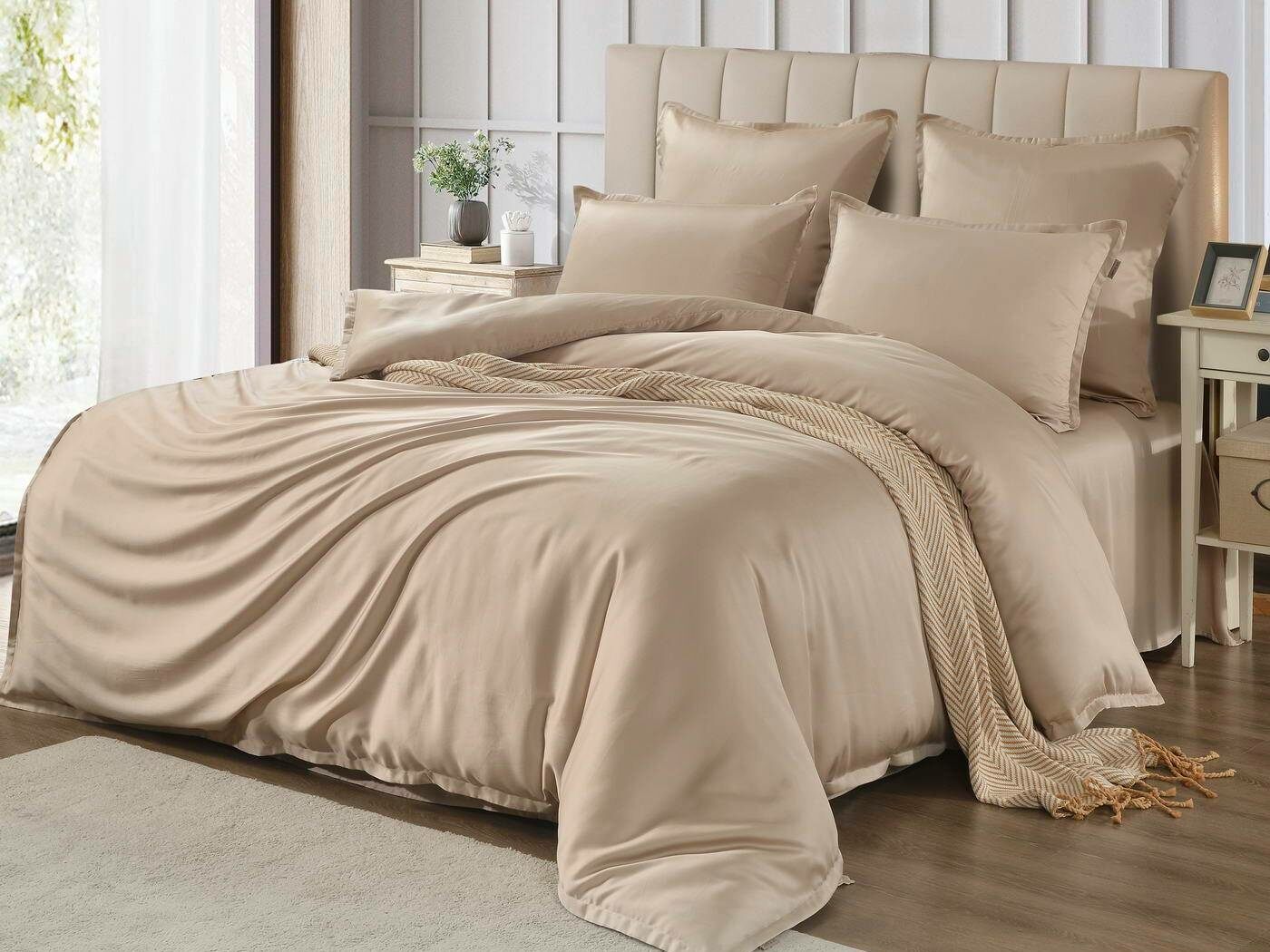 Комплекты постельного белья Ансель: нежность и комфорт каждую ночь Ищете постельное бельё, которое подарит вам незабываемый комфорт и уют? Тогда комплекты постельного белья Ансель из тенселя — идеальный выбор! Тенсель — это натуральная ткань, изготовленная из волокон эвкалипта. Она обладает рядом преимуществ перед хлопковыми тканями: более нежная, шелковистая и приятная на ощупь. Комплекты постельного белья Ансель включают в себя наволочки, простыню и пододеяльник. Они выполнены из 100% тенселя, что гарантирует высокое качество и долговечность. Одно из главных преимуществ тенселя — его способность пропускать воздух и хорошо впитывать и испарять влагу. Это обеспечивает оптимальный микроклимат во время сна, предотвращает появление неприятных запахов и бактерий. Ещё одно важное свойство тенселя — антибактериальный эффект. Это значит, что постельное бельё Ансель не вызывает аллергии и подходит для людей с чувствительной кожей. Уникальное свойство тенселя — климат-контроль. При высокой температуре в помещении ткань обладает лёгким и приятным охлаждающим эффектом, а при низкой создаёт ощущение тепла и комфорта. Комплекты постельного белья Ансель — это идеальный выбор для тех, кто ценит комфорт, качество и натуральность. Они станут отличным дополнением к вашему интерьеру и подарят вам незабываемые ощущения во время сна.
