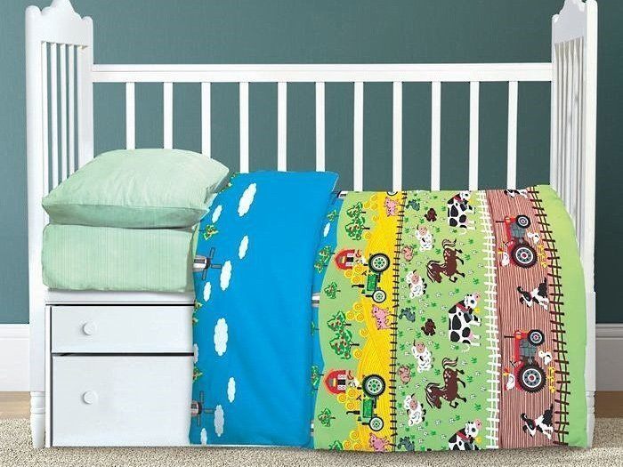Комплект детского постельного белья в кроватку из сатина (100% хлопок, плотность 128 г/м2). Упаковка: ПВХ.
