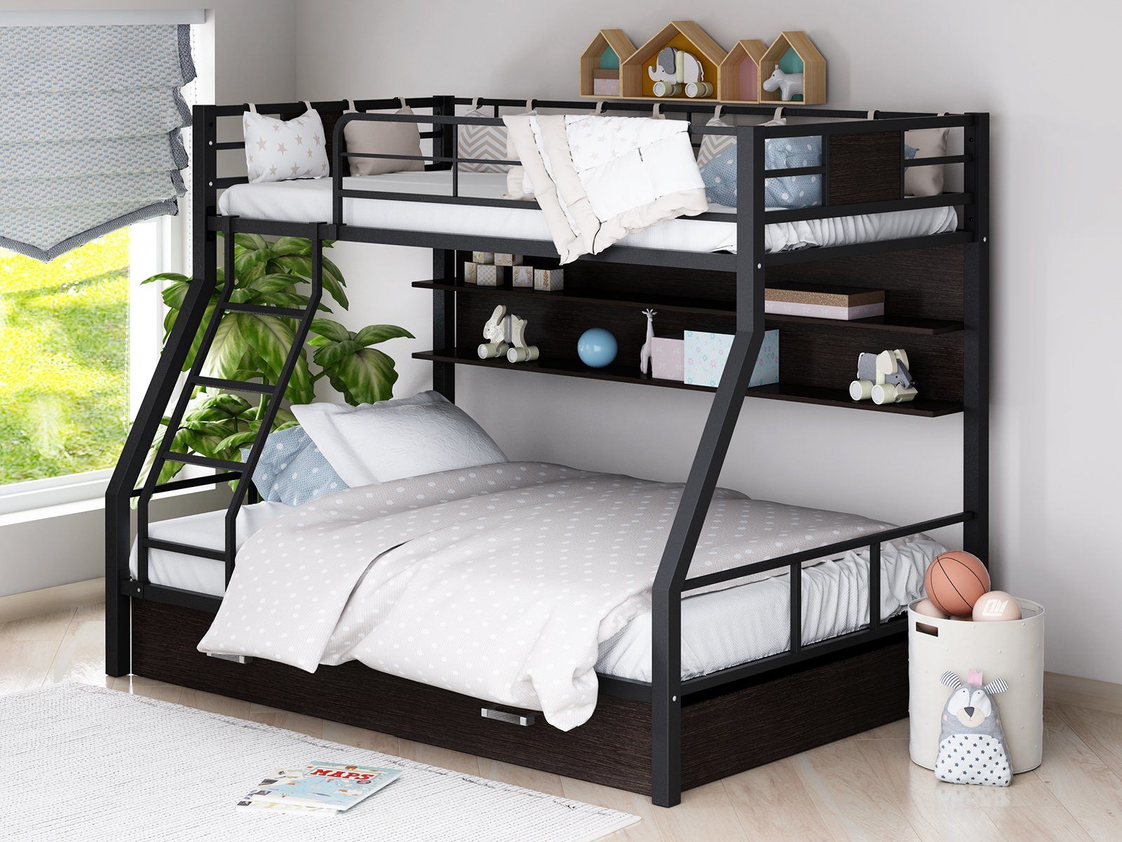 Полки отлично подойдут для размещения книг и сувениров, а выдвижной ящик, находящийся под нижним спальным местом, можно использовать для хранения постельных принадлежностей.