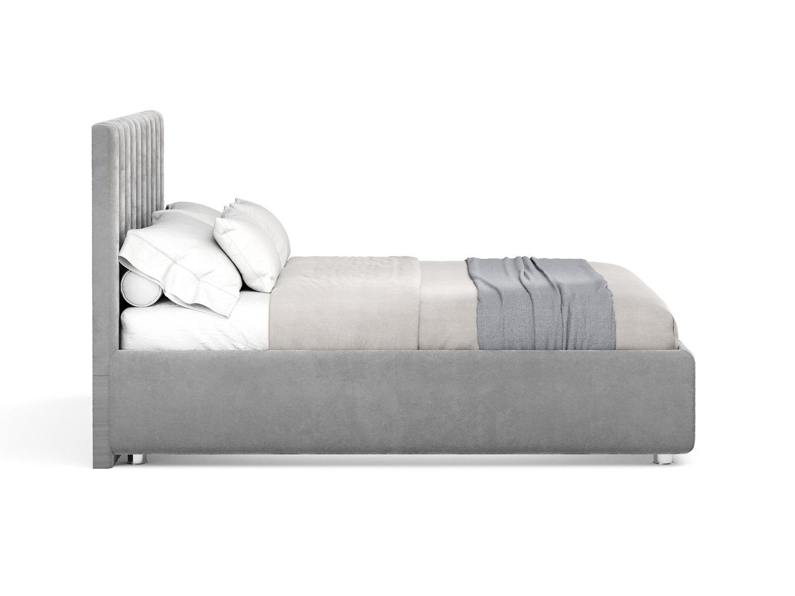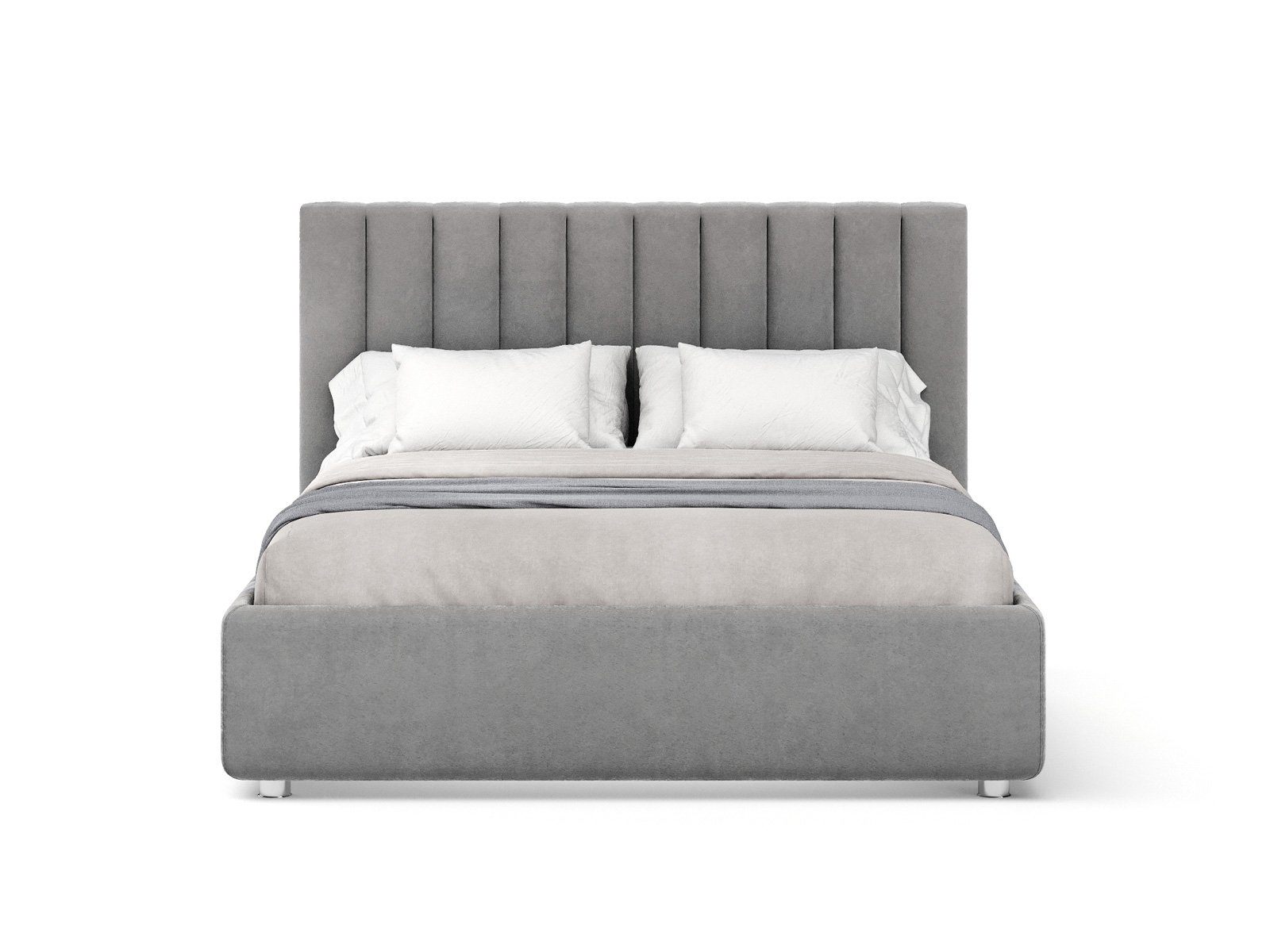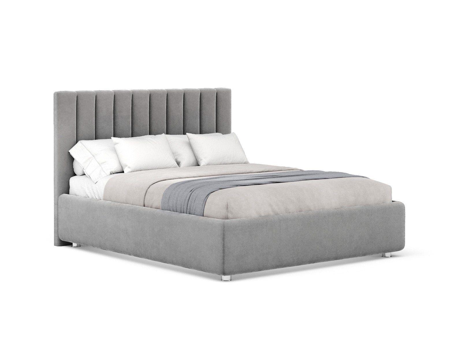 Кровать с мягким изголовьем, выполненным в виде 10 вертикальных панелей (вертикальная утяжка, всегда 10 шт независимо от размера спального места, с увеличением размера спального места увеличивается ширина панели), отличный вариант для спален с низкими потолками: вертикальный полосы на изголовье визуально вытягивают пространство.