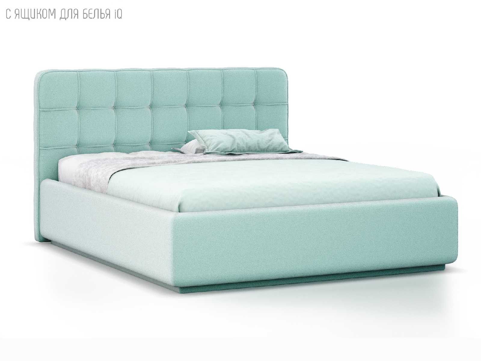 Кровать укомплектована IQ с подъемным механизмом и ящиком для белья без дна (дополнительная платная опция - дно к ящику IQ из HDF (ХДФ). Каркас кровати на цоколе, декоративный чехол на цоколе съёмный. Глубина ящика для белья - 30 см, без ограничения нагрузки на ящик.