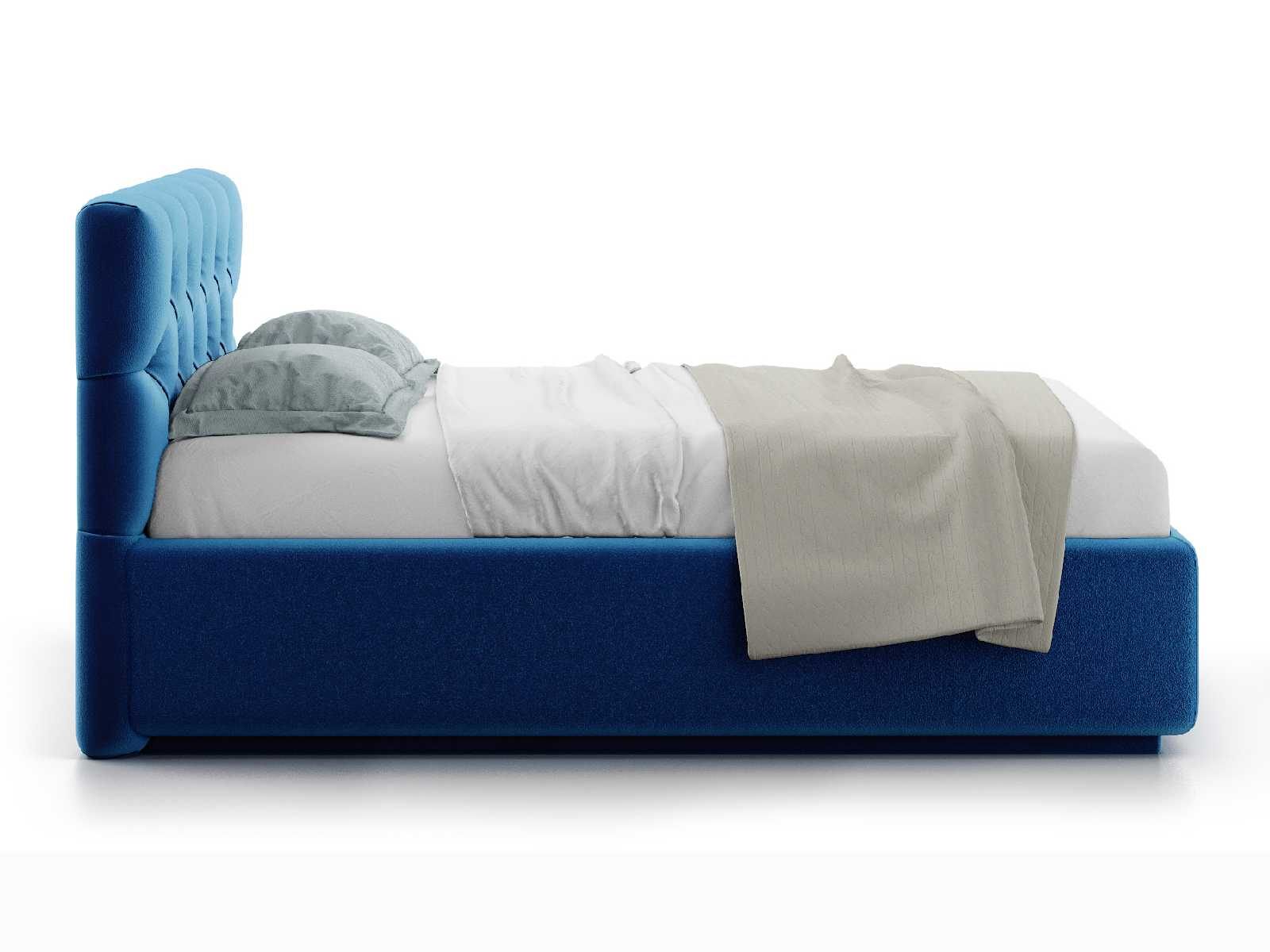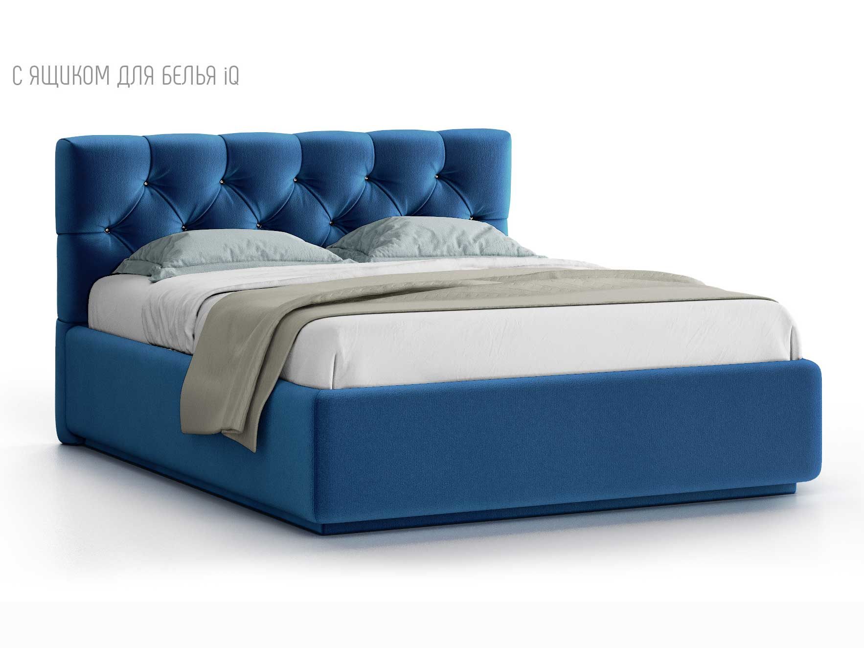 Кровать укомплектована IQ с подъемным механизмом и ящиком для белья без дна (дополнительная платная опция - дно к ящику IQ из HDF (ХДФ). Каркас кровати на цоколе, декоративный чехол на цоколе съёмный. Глубина ящика для белья - 30 см, без ограничения нагрузки на ящик.