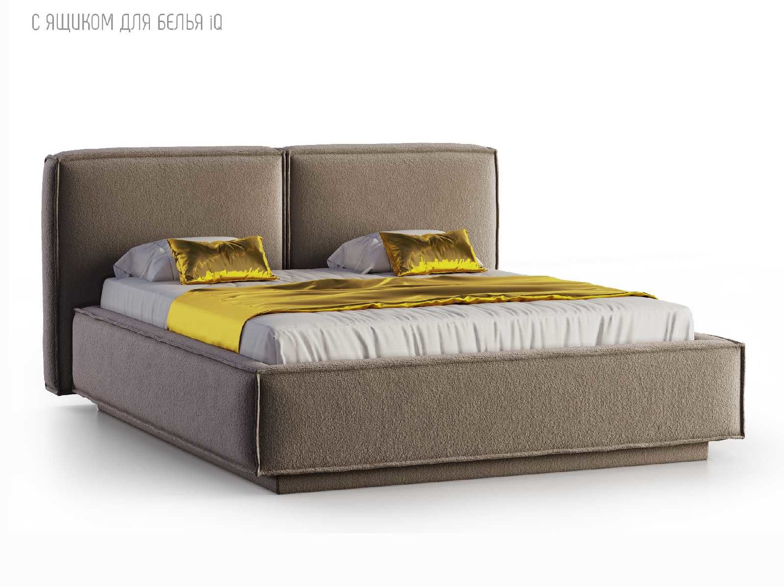 Кровать укомплектована IQ с подъемным механизмом и ящиком для белья без дна (дополнительная платная опция - дно к ящику IQ из HDF (ХДФ). Каркас кровати на цоколе, декоративный чехол на цоколе съёмный. Глубина ящика для белья - 30 см, без ограничения нагрузки на ящик.