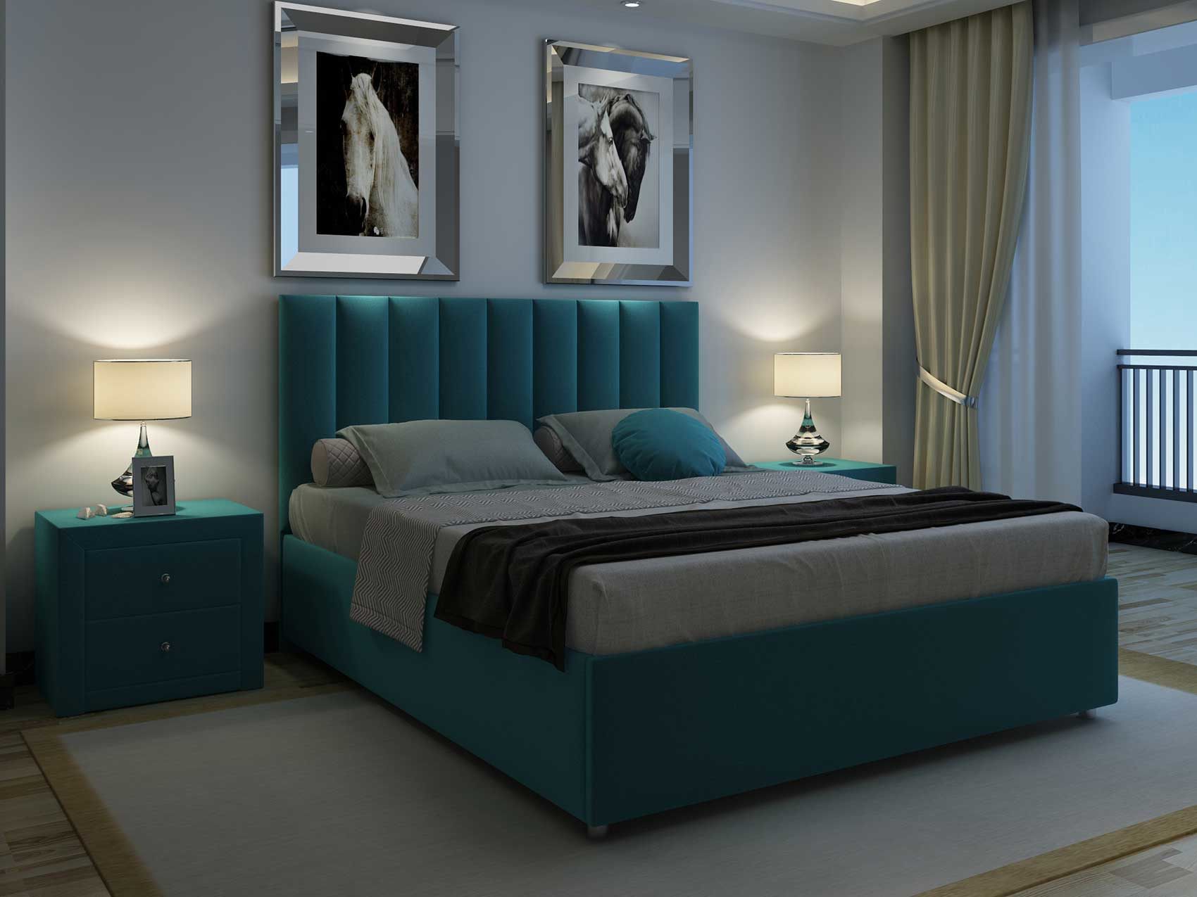 Каркас кровати изготовлен из прочного ДСП и дополнен удобными круглыми ножками. Покрытие кровати – велюр.