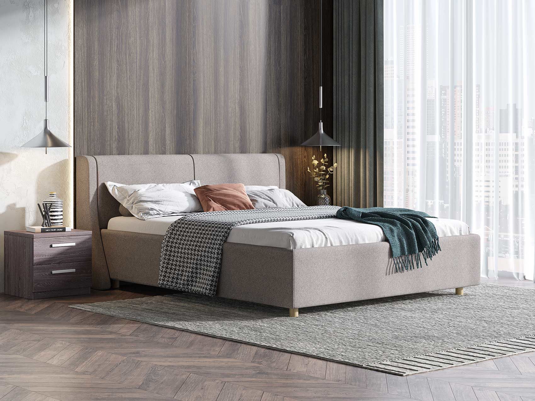 Кровать Barcelona подойдет для современных интерьеров спален, а благодаря деревянным ножкам впишется в стиль ретро, скандинавский или минимализм. При желании кровать Barcelona может быть укомплектована подъемным механизмом с бельевым ящиком.