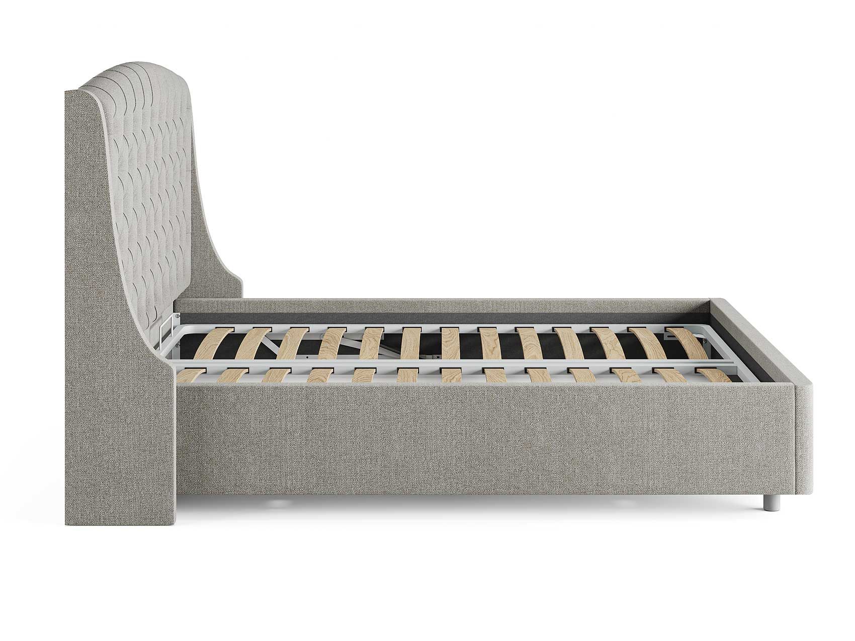 Кровать комплектуется металлическим основанием (без опор), которое имеет 13 рядов встроенных березовых ламелий на каждое спальное место, обеспечивая равномерное распределение нагрузки.