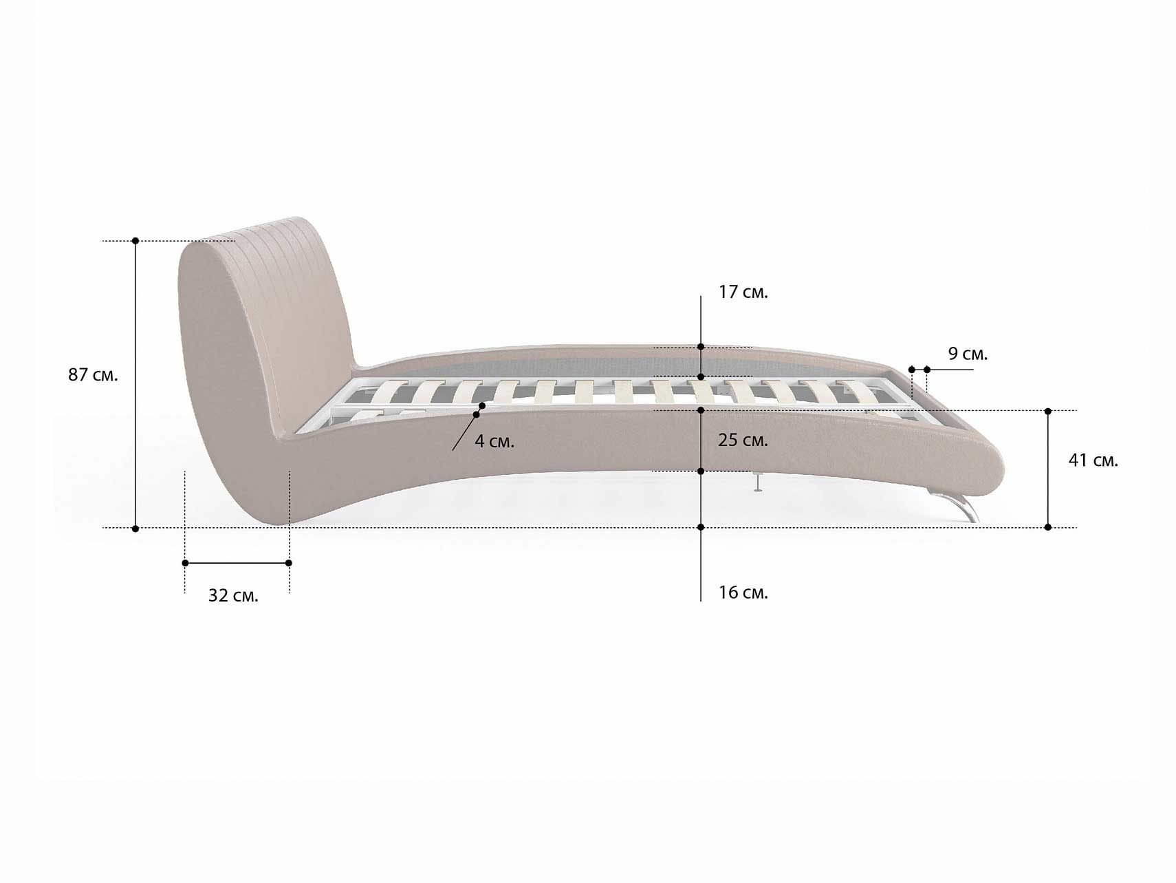 Кровать комплектуется металлическим основанием (без опор), которое имеет 13 рядов встроенных березовых ламелий на каждое спальное место, обеспечивая равномерное распределение нагрузки.