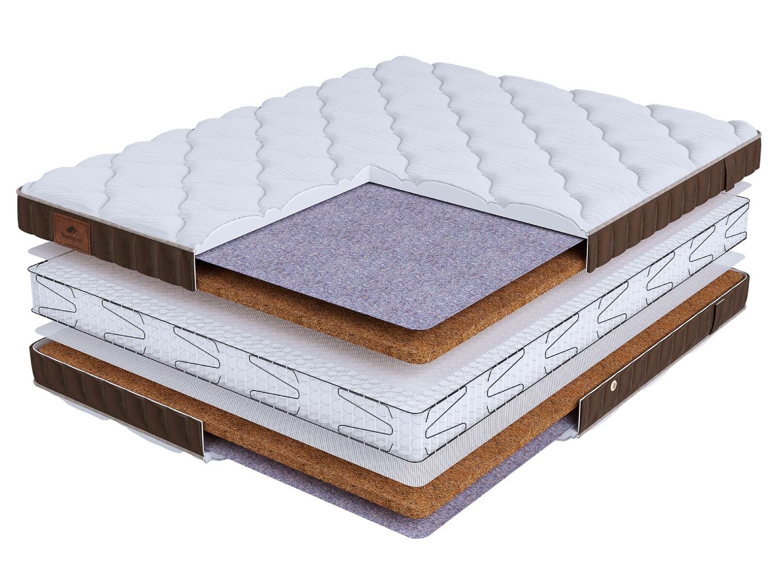 Чехол: Хлопковая трикотажная ткань чехла обеспечивает комфорт и обладает отличной воздухопроницаемостью. Высокообъемная стежка с использованием холлофайбера (600гр.) подарит дополнительный комфорт спальному месту. Изысканный бурлет из мягкого велюра красивого бежевого цвета придает матрасу роскошный внешний вид и подчеркивает его премиальный статус. Каждая модель серии LIFE украшена фирменной кожаной биркой BeautySon, подтверждающая исключительность каждого матраса.