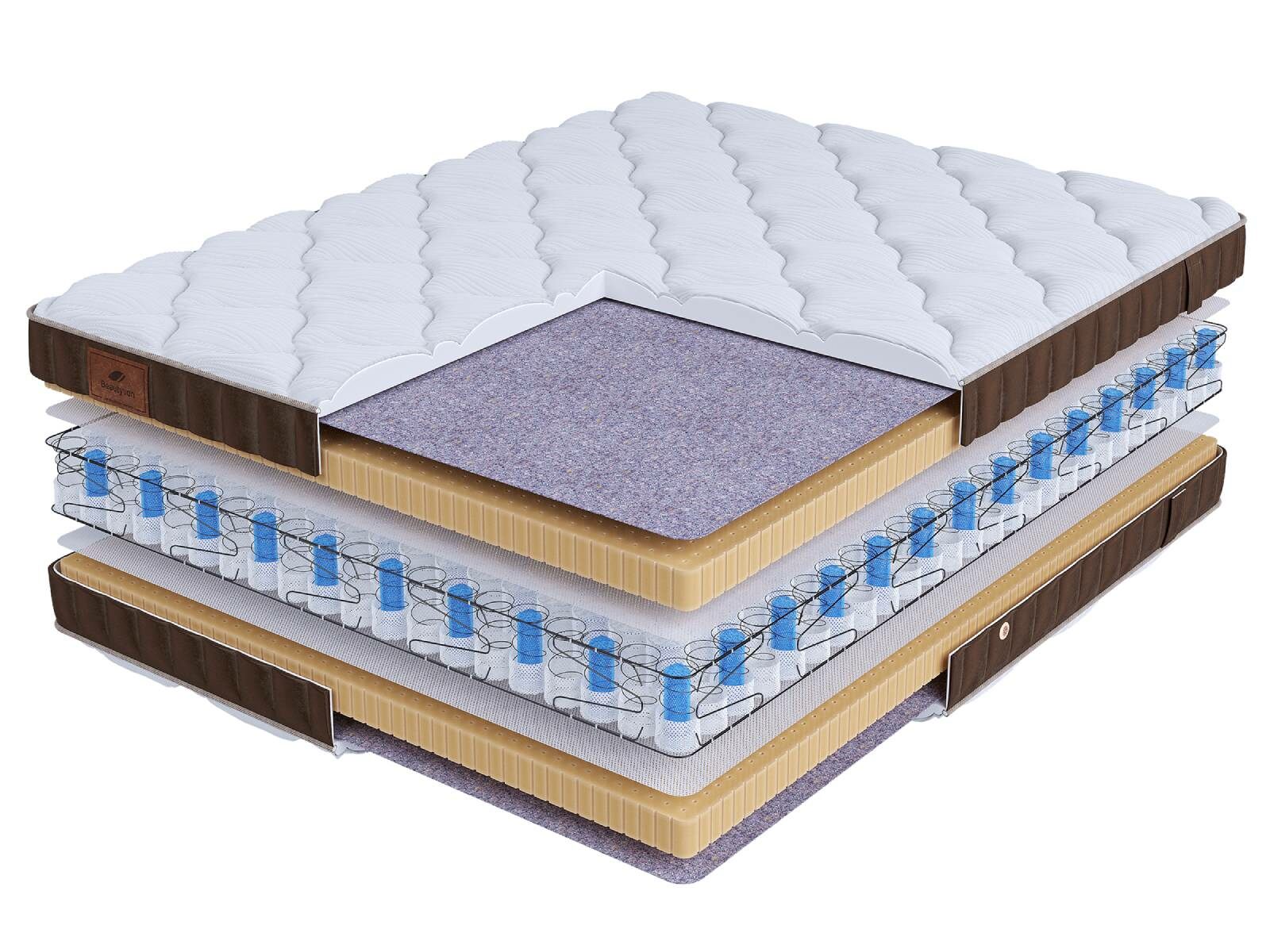 Хлопковая трикотажная ткань чехла обеспечивает комфорт и обладает отличной воздухопроницаемостью. Высокообъемная стежка с использованием холлофайбера (600гр.) подарит дополнительный комфорт спальному месту. Изысканный бурлет из мягкого велюра красивого бежевого цвета придает матрасу роскошный внешний вид и подчеркивает его премиальный статус. Каждая модель серии LIFE украшена фирменной кожаной биркой BeautySon, подтверждающая исключительность каждого матраса.