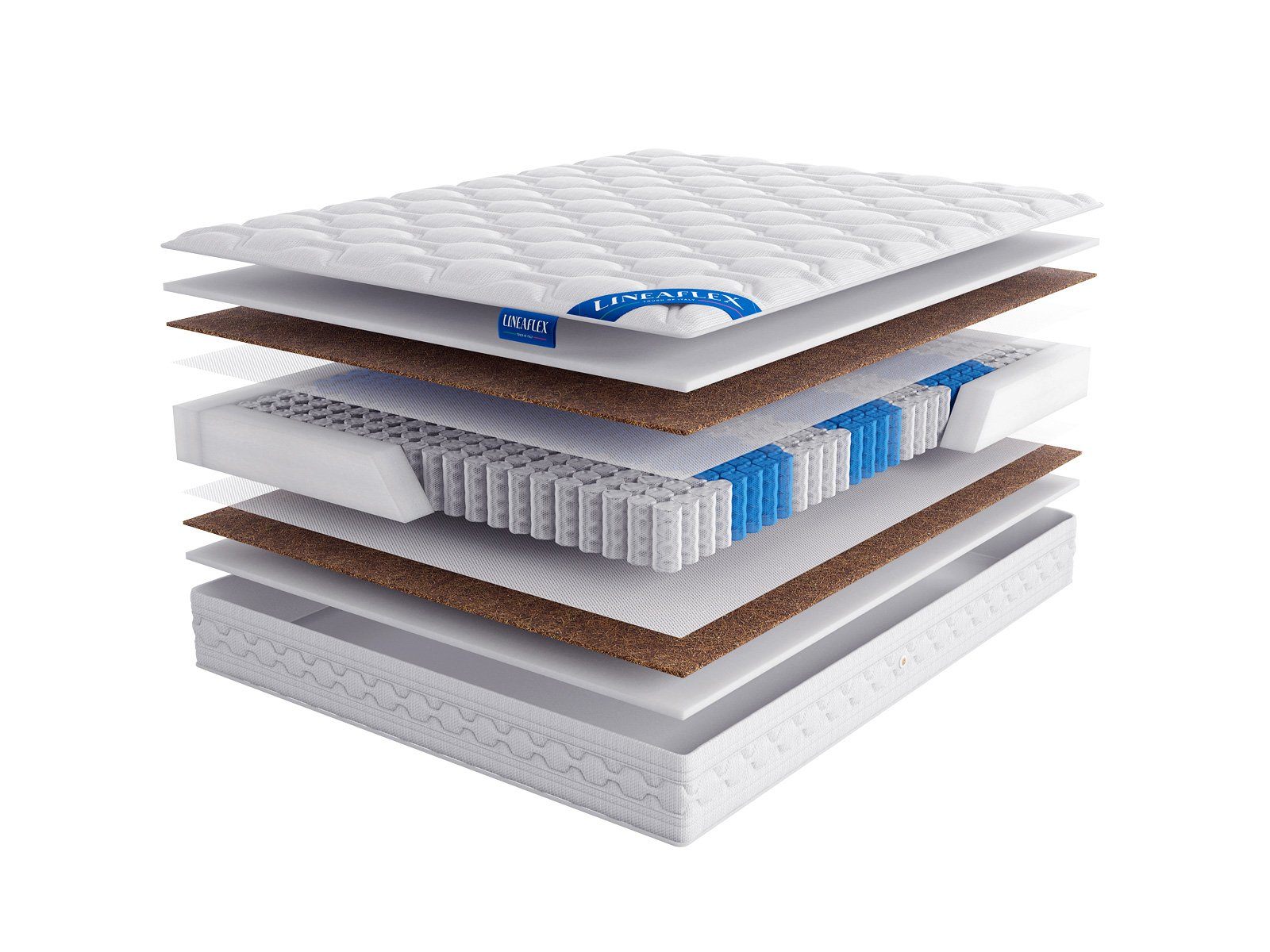 Однако одного пружинного блока для комфорта отдыхающего мало. Вот почему в матрасе также проложены настилочные слои из недеформируемой пены ERGOFLEX, а также плиты натуральной латексированной койры кокоса.