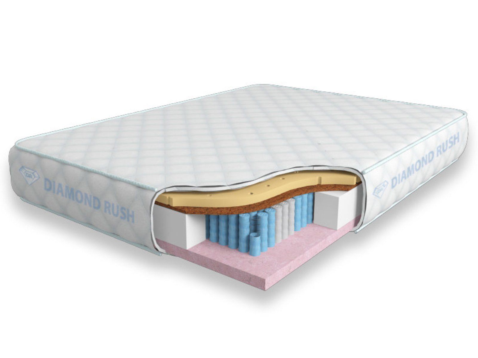 Данный матрас из серии Luxury Diamond имеет в своей основе независимый пружинный блок MultiZone, состоящий из пружин диаметром 3-4 см разной жесткости. В качестве настилочных слоев поверх пружинного блока используются такие материалы, как перфорированный натуральный латекс, кокосовая койра и вязкоэластичный Меморикс, обладающий эффектом памяти. Стороны матраса ощутимо различаются по жесткости.