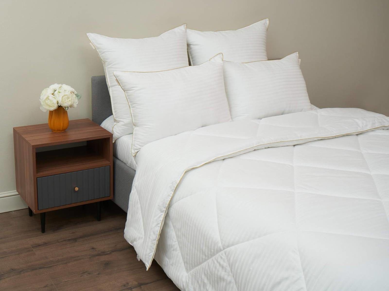Подушки и одеяла SOFI изготовлены из ткани страйп-сатин. Эта ткань придает изделиям дополнительную гладкость и изящность из-за шелковистого блеска.