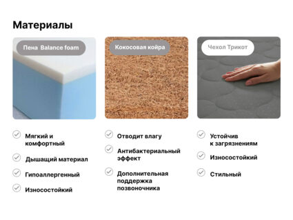 Койра и пена свободно вентилируются и обеспечивают матрасу режим постоянного проветривания. Это значит, что в матрасе не будет скапливаться пыль и запахи. Кроме того, койра обладает естественным антибактериальным эффектом.