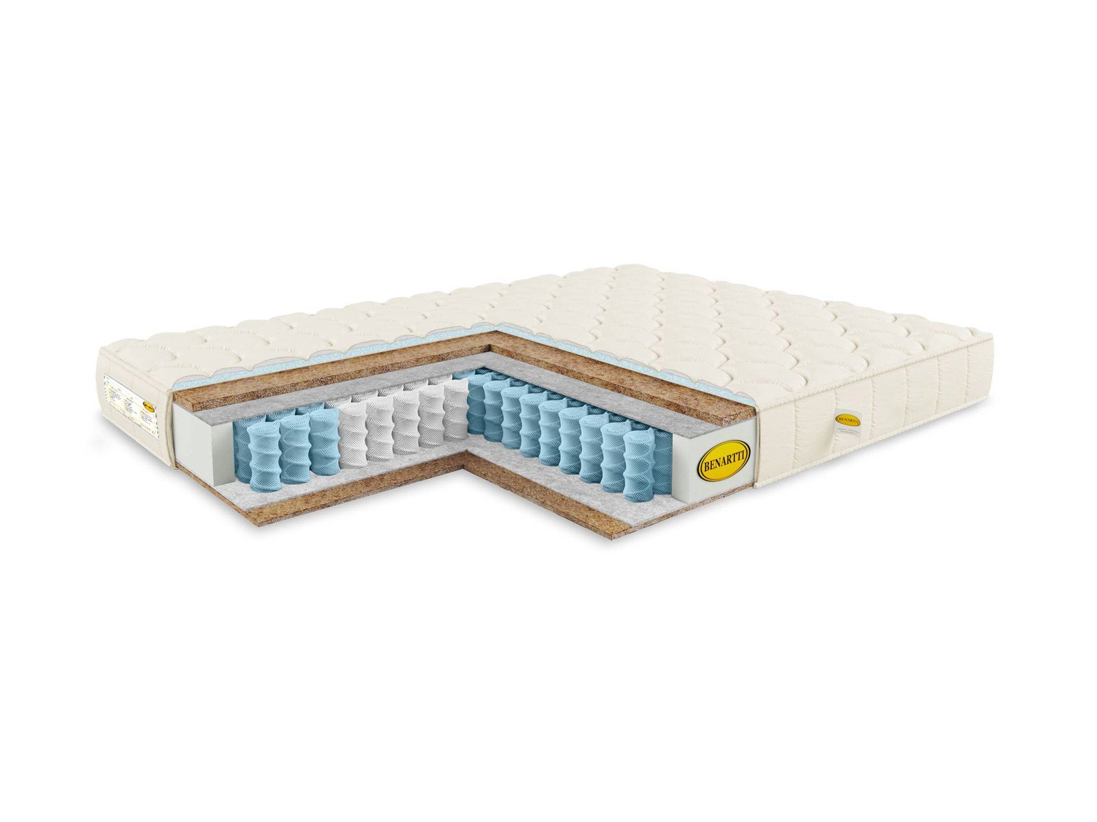 Различные уровни жёсткости достигаются с помощью наполнителя, установленного в различной толщине. С одной стороны проложена 1 см плита кокосовой койры, а с противоположной – 2 см. Этот полностью натуральный наполнитель оказывает великолепную ортопедическую поддержку, а также сохраняет здоровый климат спальной зоны – материал отлично пропускает воздух.