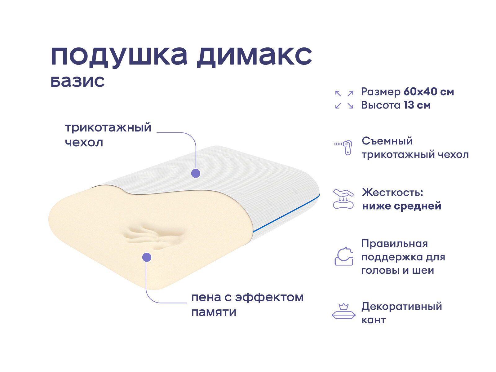 Мягкая анатомическая подушка классической формы. Модель универсальна и подойдёт для любой кровати и спальни. Наполнителем выступает инновационная пена мемори, которая запоминает линии тела. Это свойство позволяет подушке очень точно адаптироваться под любые особенности анатомии, делая сон очень комфортным. Модель бережно поддержит голову и шею в анатомически правильном положении. Подушка рассчитана на отдых в любой позе – сон на спине, животе или боку будет одинаково уютным.