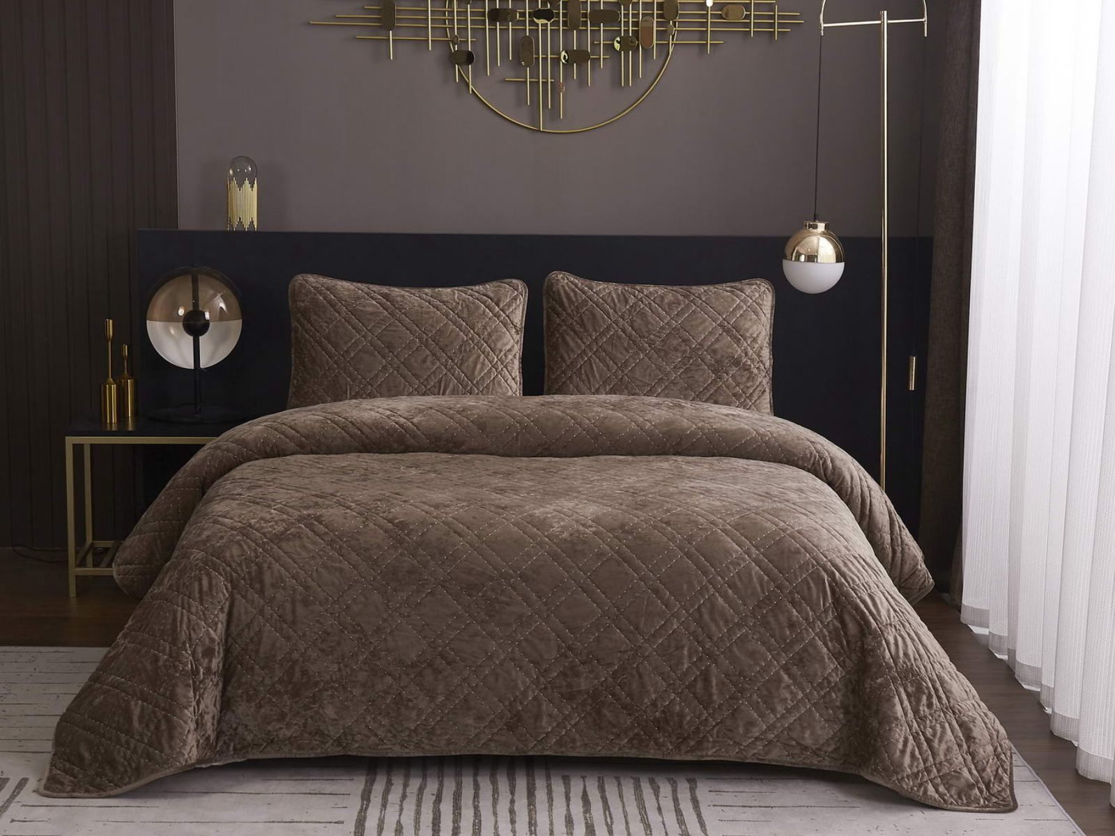 Покрывало Селена выполнено в девяти оттенках: пудра, антрацит, беж, изумруд, капучино, пепел роза, серебро, стоун, терракот. Они подойдут практически для любого интерьера, от классического, до модерна или романтического. Стеганое бархатное покрывало будет необыкновенно смотреться на вашей постели. В комплект входят покрывало и одна либо две наволочки (50х70 см) из аналогичного материала в зависимости от размера.