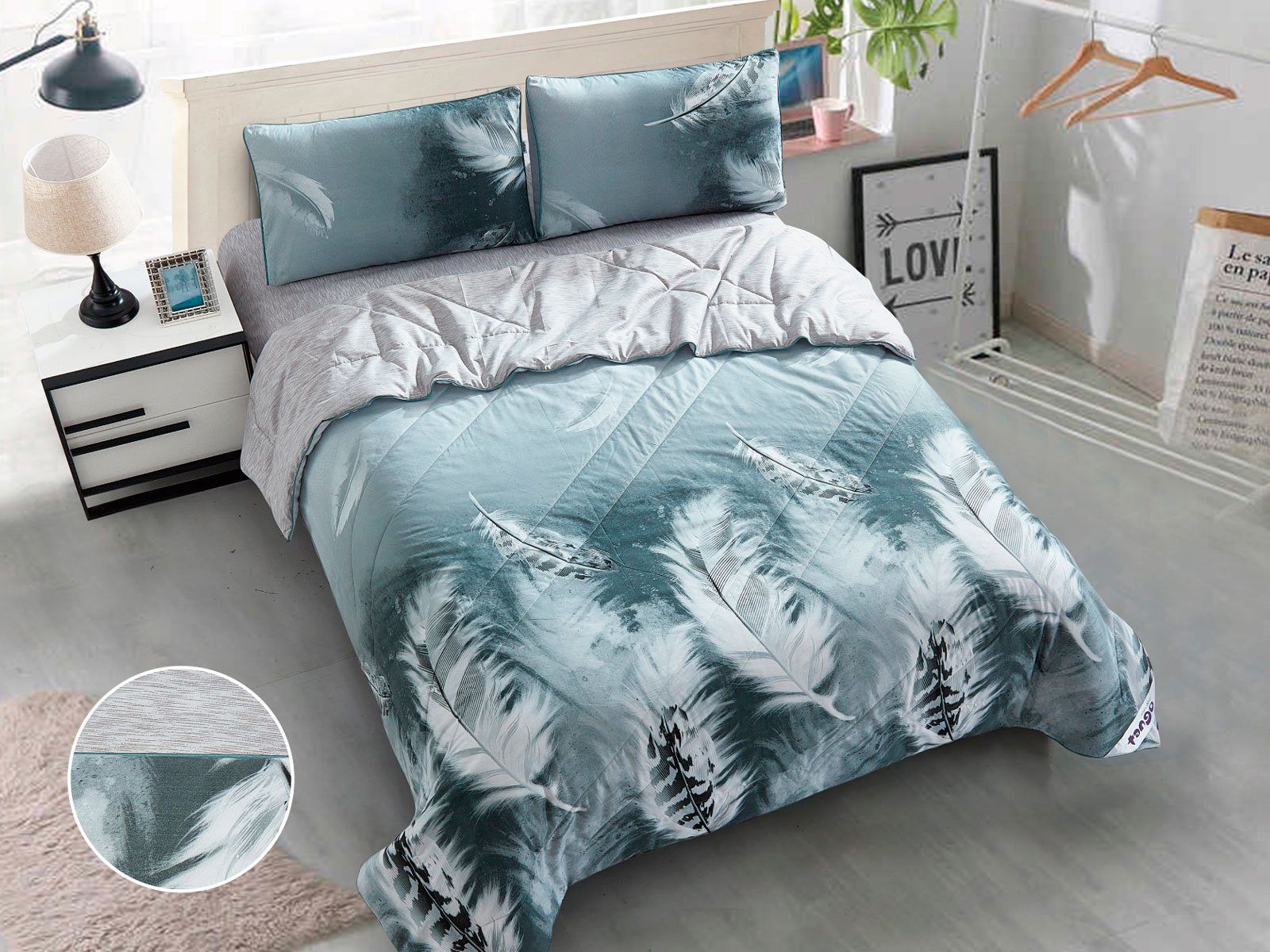 В данный комплект вместо пододеяльника входит облегченное одеяло. Комплект подойдет тем, кто устал от мучительного натягивания пододеяльников на одеяло.